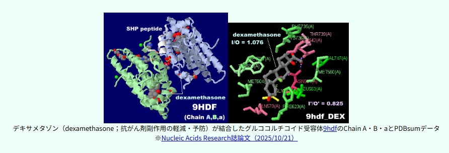 #カガク##がん#生体分子#分子#医薬。鍵と鍵穴。グラデーション。11/12公開のPDBデータ9HDFのA・B・a鎖とPDBsumデータ,デキサメタゾン(dexamethasone;抗がん剤副作用の軽減・予防)が結合したグルココルチコイド受容体。Jmol抗がん剤開発と標的タンパク質 ecosci.jp/pdb/slp_j.html pic.x.com/iKpKMF4qXu