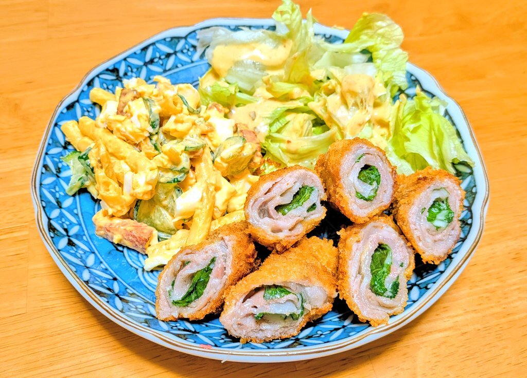くるくる巻いて揚げ焼き 夜ごは〜ん  豚バラ大葉チーズ巻き巻き  マカロニサラダ もっとチーズ増やせばよかった 飛び出すのビビってたのん #夜ごはん #晩ごはん #カツ #豚バラ pic.x.com/oAPeWJXrFV