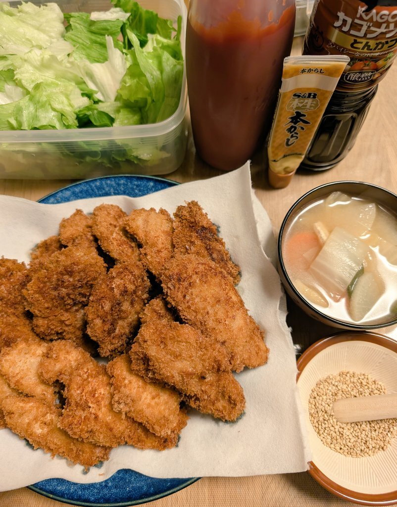ヒレカツとチキンカツ レタスの塩とレモンかけたん 大根白菜ねぎ油揚げ人参味噌汁 半額のヒレ肉GETしたので久々のカツ♪ すりごま辛子ソースで 🍅とキャベツが食べたかったけど どちらも1個300円で諦めました 何もかも高いし献立もあるもんで が普通になってきたわぁ🙂 #カツ pic.x.com/pd0GksB6iE