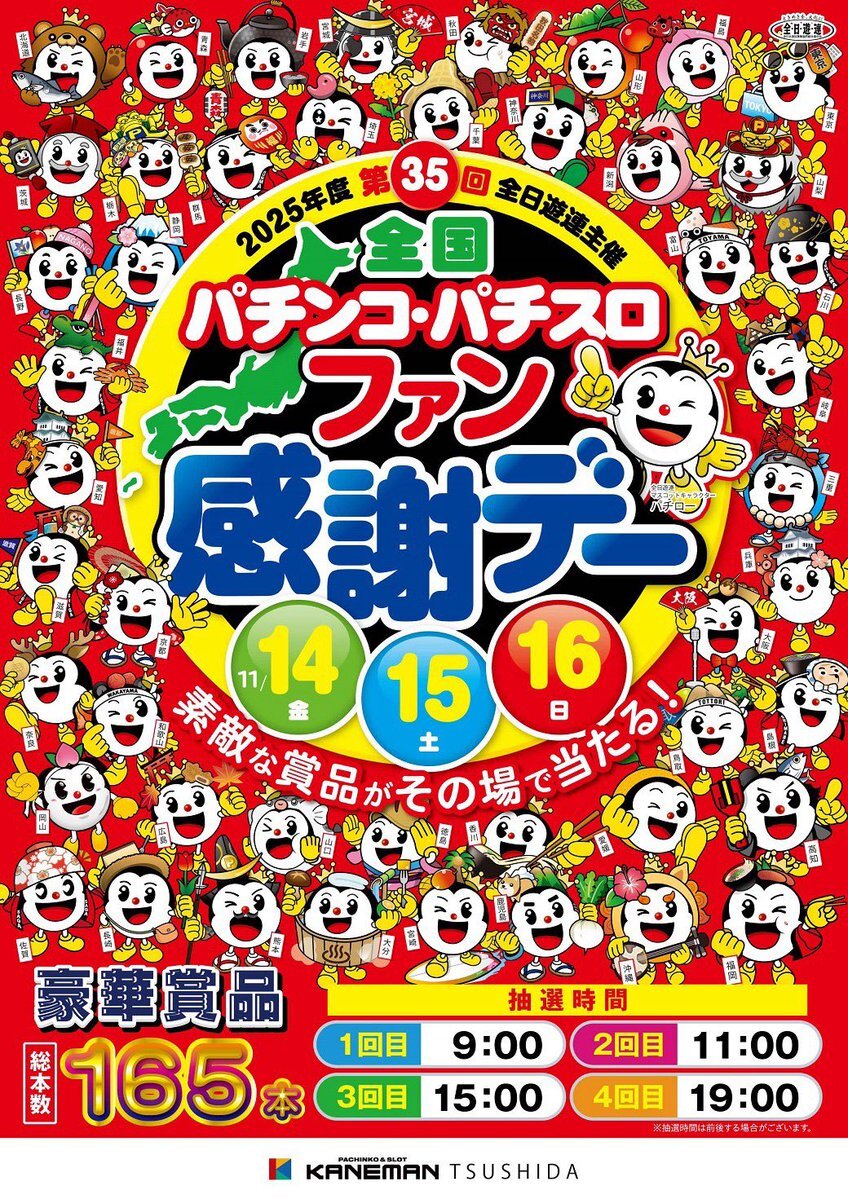 🎊明日14日(木)〜16日(土)🎊 ✨全国パチンコ・パチスロ ファン感謝デー✨ 3日間堂々開催‼️ 期間中は毎日🎯一等当たるカモ⁉️のクジ配布🎁 今回はなんと朝イチ入場時にもお配りします🌅 全台朝9時フルオープン⏰‼️ #カネマン津志田 #カネマン #ファン感謝デー #パチンコ #スロット #クジ #朝イチ pic.x.com/WQRR2obhvp
