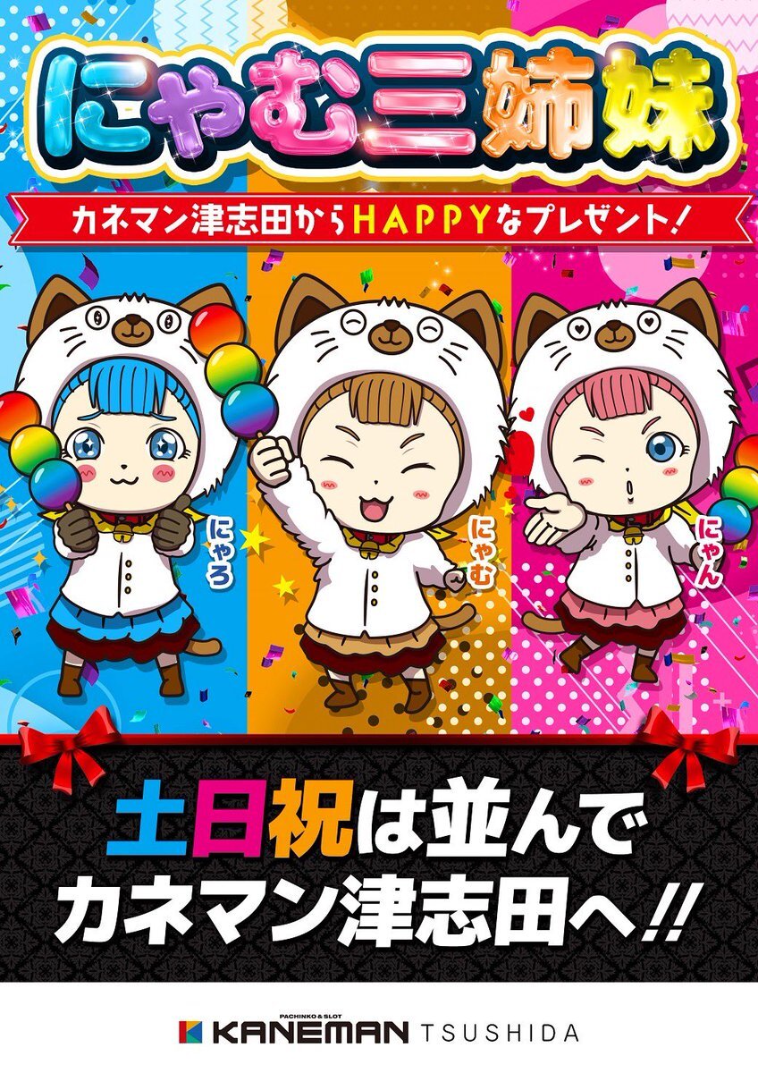 明日22日(土)!✨ 週末恒例‼️にゃむ3姉妹が元気に大活躍🐾 “創業月間だから出来る”特別な週末💥 導入済新台🎯から人気機種🔥まで勢揃い! さらに週末スイーツもご用意🍰✨ 全台 朝9時フルオープン⏰‼️ 明日もカネマンで思いきり楽しもう🎉 #カネマン #盛岡 #パチンコ #スロット pic.x.com/ziMlJ2nlbf