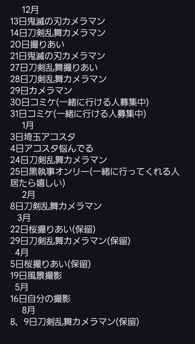 現在の予定 その他の予定をゆるく募集 画像以外の基本土日祝でお願いします お誘いお待ちしてます。(*^^*) 予定が増えたため更新 #コスプレイヤーさんと繋がりたい #カメラマンさんと繋がりたい pic.x.com/WsaK7ezguF