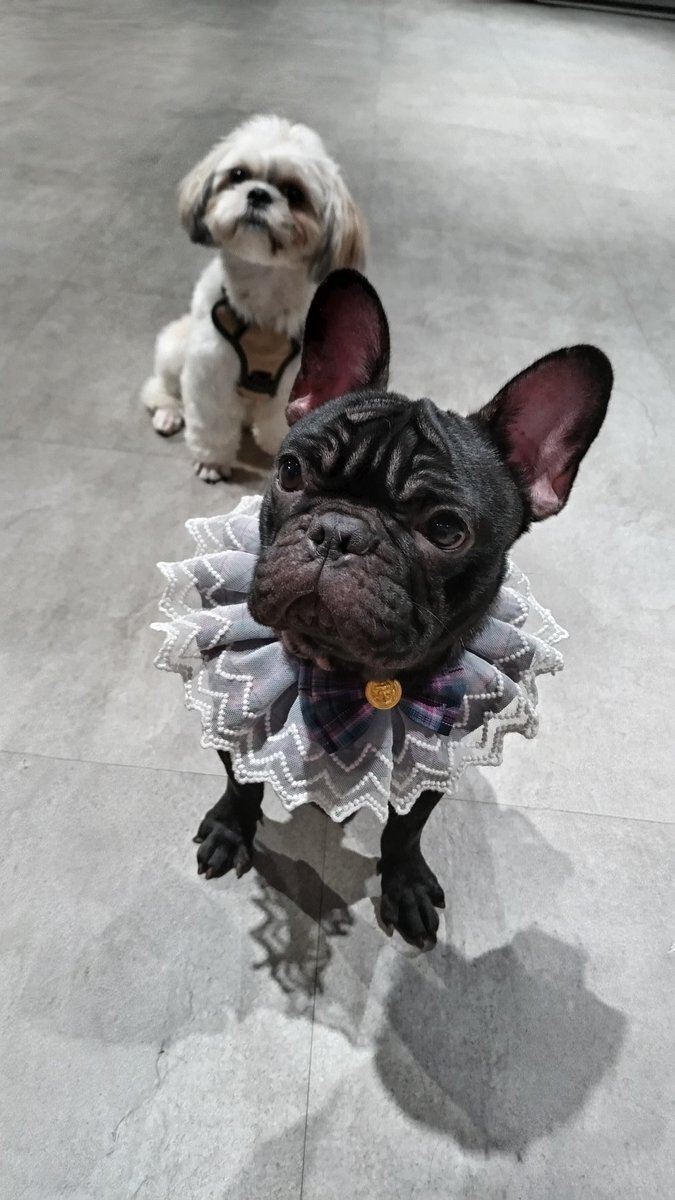 11月11日はフレンチブルドックのおはぎちゃんの誕生日! 可愛くおめかししてました 誕生日おめでとう🎊 #カワスイ 後ろにいるのは、シーズーのしずくちゃん pic.x.com/qwVfQX65vZ x.com/kawasui_aqua/s…