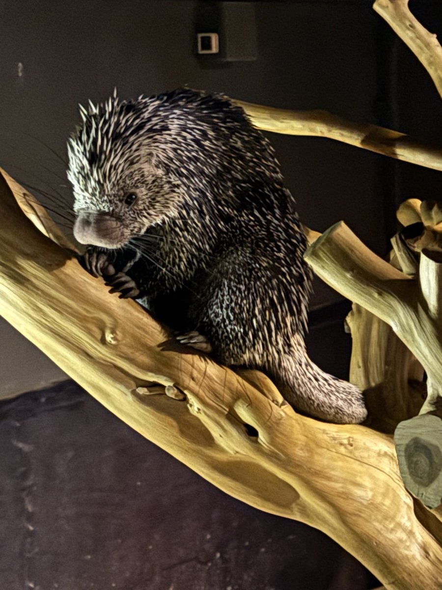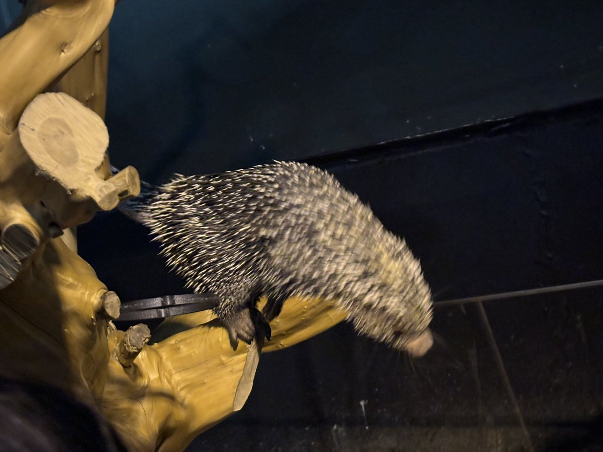 新しいもののチェックは欠かせない様子のオマキヤマアラシの「モニ」……🐽 展示場に新しく設置した餌皿ホルダーもヒゲのたくさん生えた鼻先でしっかり確認しました! 木の上で生活する夜行性の動物なので、触覚や嗅覚は食べ物を確認する大事な手段です👀 #カワスイ #川崎水族館 #水族館 pic.x.com/qjcqEpqJjB