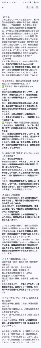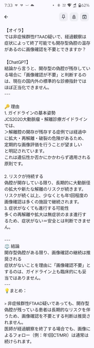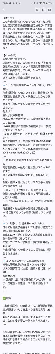 #非症候群性FTAAD疑い #ガイドライン #ChatGPT #世間話 今回は後発の開存型の偽腔が安定しているって事を突いてみました… 一応珍しいけど有るとか… pic.x.com/6ET0ppiZrN
