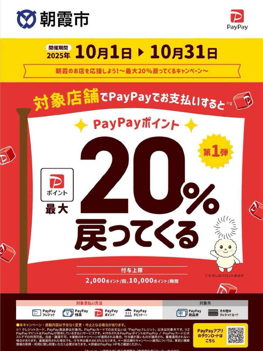 10月1日から朝霞のお店を応援しよう!最大20%戻ってくるキャンペーンが始まります。(10月31日まで) 朝霞市では、エネルギー価格や物価高騰の影響を受けた市内の中小企業や個人事業主への支援を目的に、キャッシュレス決済ポイント還元事業を行います。