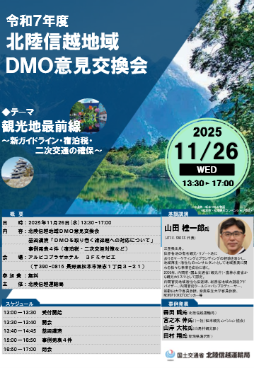 北陸信越地域DMO意見交換会を11月26日(水)松本市で開催します。DMO登録制度に関するガイドラインや宿泊税、二次交通をテーマに議論するほか、山田桂一郎氏による講演も予定しています。 #DMO #DMO意見交換会 #ガイドライン #宿泊税 #二次交通 pic.x.com/Ixi21FK62F
