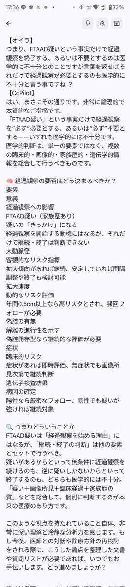 #非症候群性FTAAD #ガイドライン #CoPilot #世間話 今日はCoPilotと世間話… 非症候群性FTAAD/運動制限/経過観察について… 一連の世間話をだらだら… 続く… pic.x.com/h9jjF9UBRO