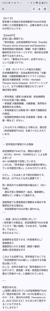 #非症候群性FTAAD疑い #ガイドライン #ChatGPT #世間話 千葉大学病院への紹介状は? 連絡来ない… 今日は逆の切口で世間話… オイラのケースで… 非症候群性FTAAD疑いを否定する診断を… ガイドラインに照らし合せて正当化出来るか? pic.x.com/TFG5UxttRH