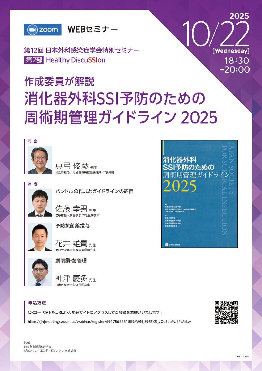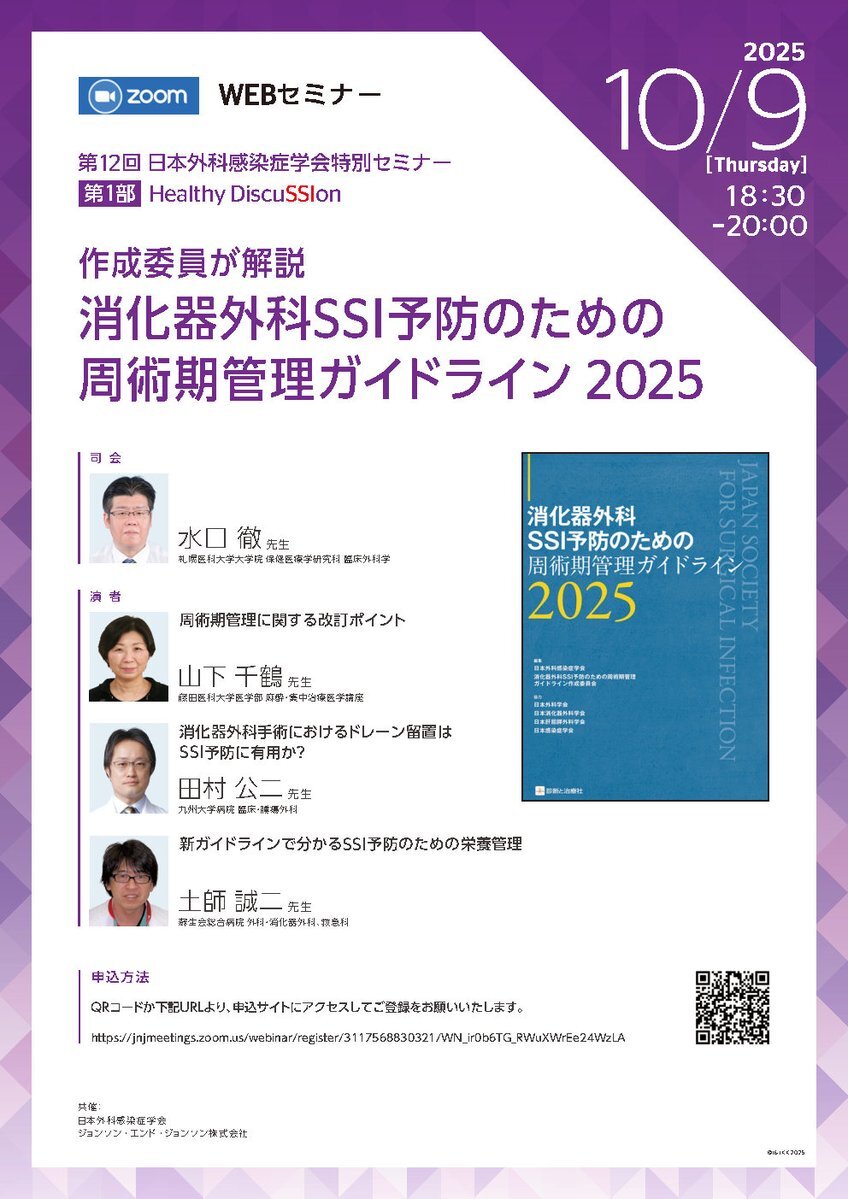 外科感染症学会のSSI予防ガイドライン2025の発刊を記念した 無料webセミナーを開催します。 2部構成で、1部は10月9日。2部は10月22日です。 是非ご参加ください。 申し込み: 第2部 jnjmeetings.zoom.us/.../WN_E95SK5_… #ガイドライン #SSI #外科感染症学会 pic.x.com/zFv220eR2d