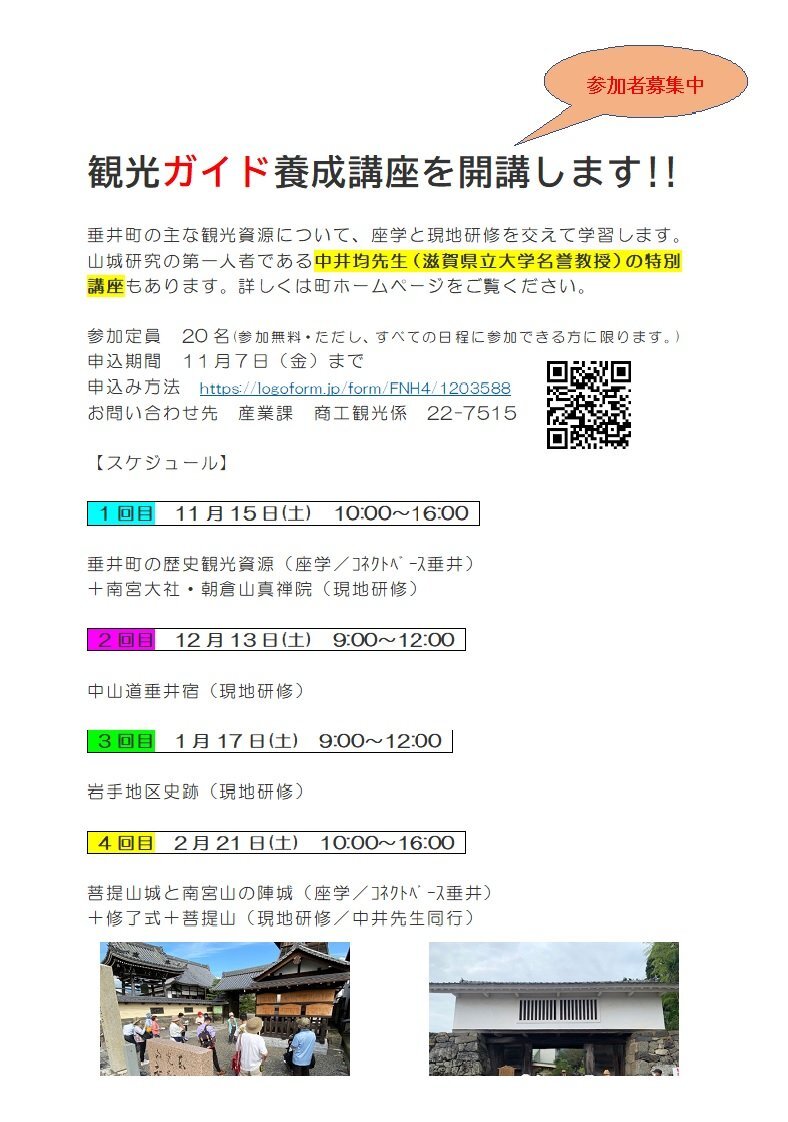 垂井町ガイド養成講座の受講者を募集中です。 垂井町の観光について、一緒に学びませんか?最終日には中井均先生の特別講座もあります。 ※4日全て参加できる方に限ります。 #垂井町 #観光 #ガイド #中井均先生 logoform.jp/form/FNH4/1203… pic.x.com/V5xjNzjL33