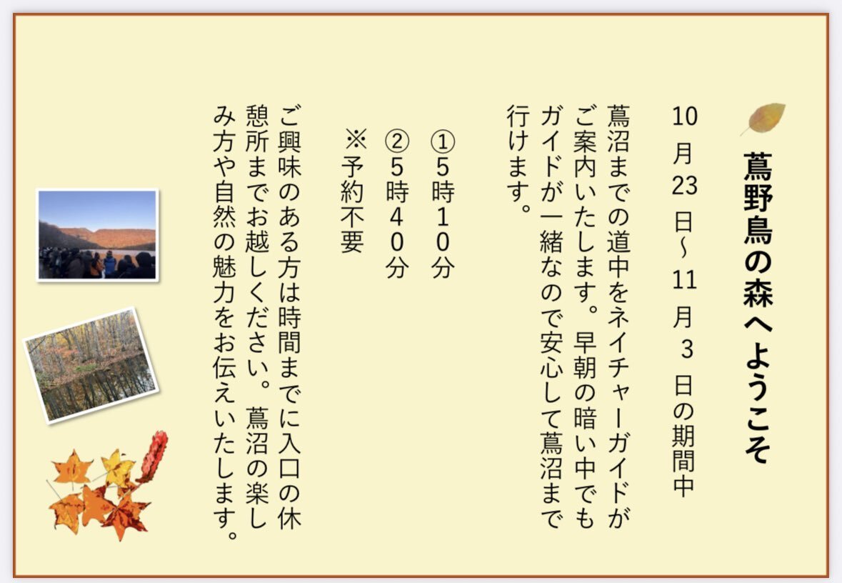 ネイチャーガイドがご案内 蔦沼までの道中をネイチャーガイドがご案内します。 ガイドが一緒なので早朝の暗い中でも安心です 実施日:蔦沼ルール期間中毎日 時間 :5時10分 :5時40分 ご興味のある方は時間前までに、蔦沼遊歩道入口の休憩所までお越し下さい。 #蔦沼 #ガイド pic.x.com/GE8SAWfFva