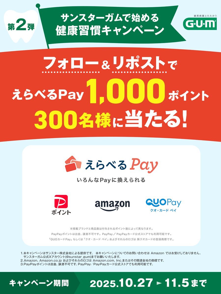 // プレゼントキャンペーン 第二弾🎉 \\ フォロー&リポストで、 【えらべるPay 1,000ポイント】を抽選で300名様にプレゼント🎁 えらべるPayで健康習慣をもっと快適にして、健やかなお口をキープ! 歯周病予防のGUMが「自分らしい健康」づくりを応援します。 ▼応募方法▼ ① @sunstar_gum