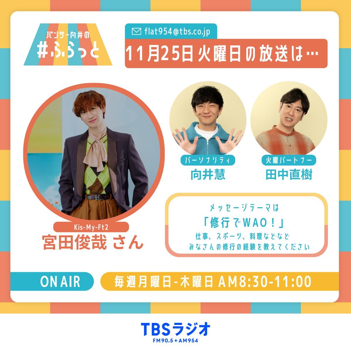 明日11月25日(火)の#ふらっと📻 ✉️9時台のゲストは、小説家としても活躍中、Kis-My-Ft2・宮田俊哉さん( @t_miyata_kmf2 )! ✉️メッセージテーマは、「修行でWAO!」