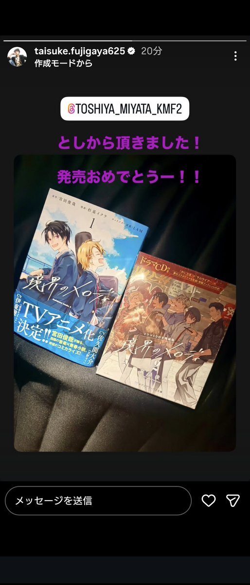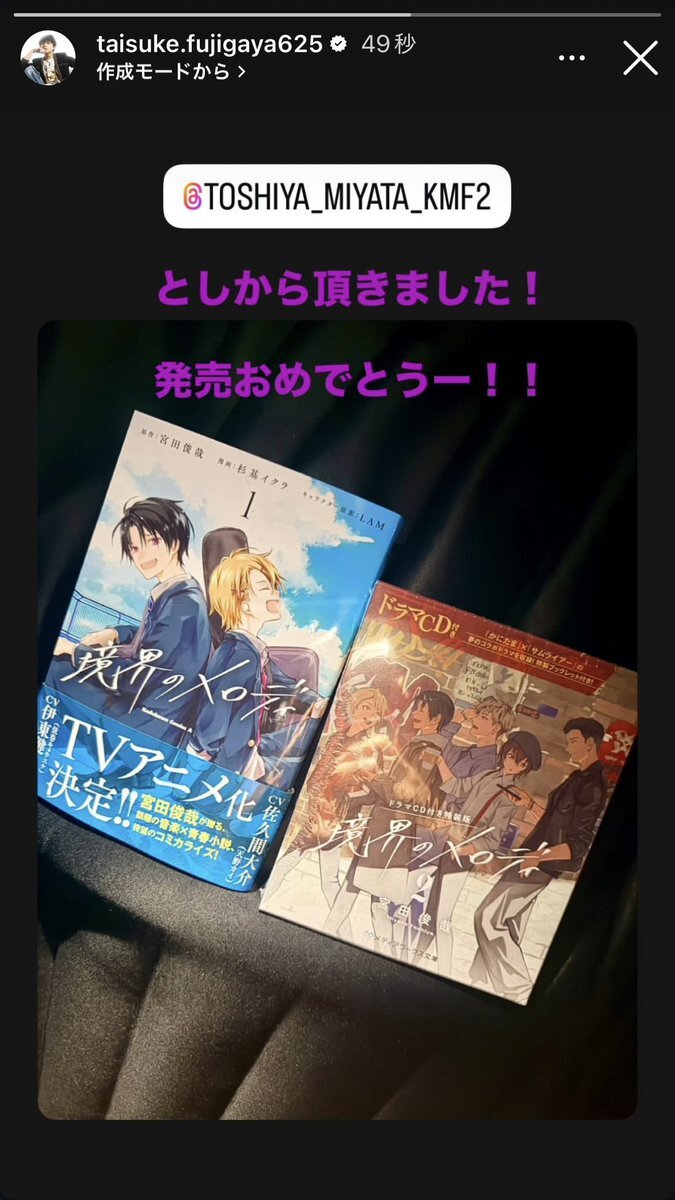藤ヶ谷くん、宮田くんから 境界のメロディをプレゼントしてもらったんだね☺️🩷💜 #たいすたぐらむ #KisMyFt2 #キスマイ #藤ヶ谷太輔 instagram.com/stories/taisuk…