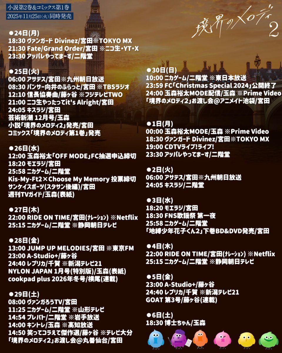 今週はいよいよ #境界のメロディ 小説新刊&コミックス発売👏🏻 俊くんは生放送(生配信)多めウィークでお渡し会も💜 玉の芸術新潮・TVガイド・NYLON、日曜24時にはついに #たまモード 配信💛 わたのクックパッドプラス連載 #君のためのワタルごはん🧡 #キスマイ #kismyft2 pic.x.com/ZVTLEDsrLq