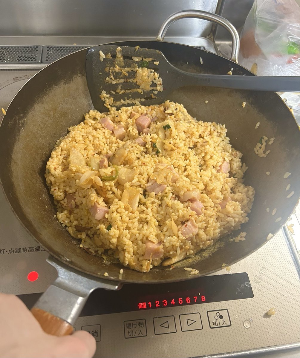 量は3人分ですが、 ウチ1人で食べる前提です。 作り置きが出来ました✌️ (あちこち米飛んで汚いので注意💦) #幽神家の食卓 #キムチ炒飯 pic.x.com/2SG7Q4BOBU