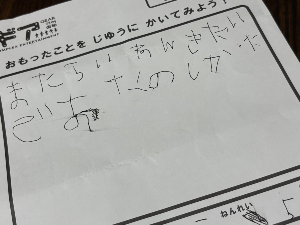 パパと二人で来られた女の子👧「またらいねん きたいです。たのしかった」🎅#クリスマスギア に“一年に一度の特別な✨お楽しみ”の気持ちを感じていただけたのかもしれません💘6才の時にもまた来てね!👋 #ギア #ギア京都 #GEARKYOTO #ロングラン公演 #御客様(#オン・キャクヨウ) #アンケート(5才) pic.x.com/wG8mZS6JJB
