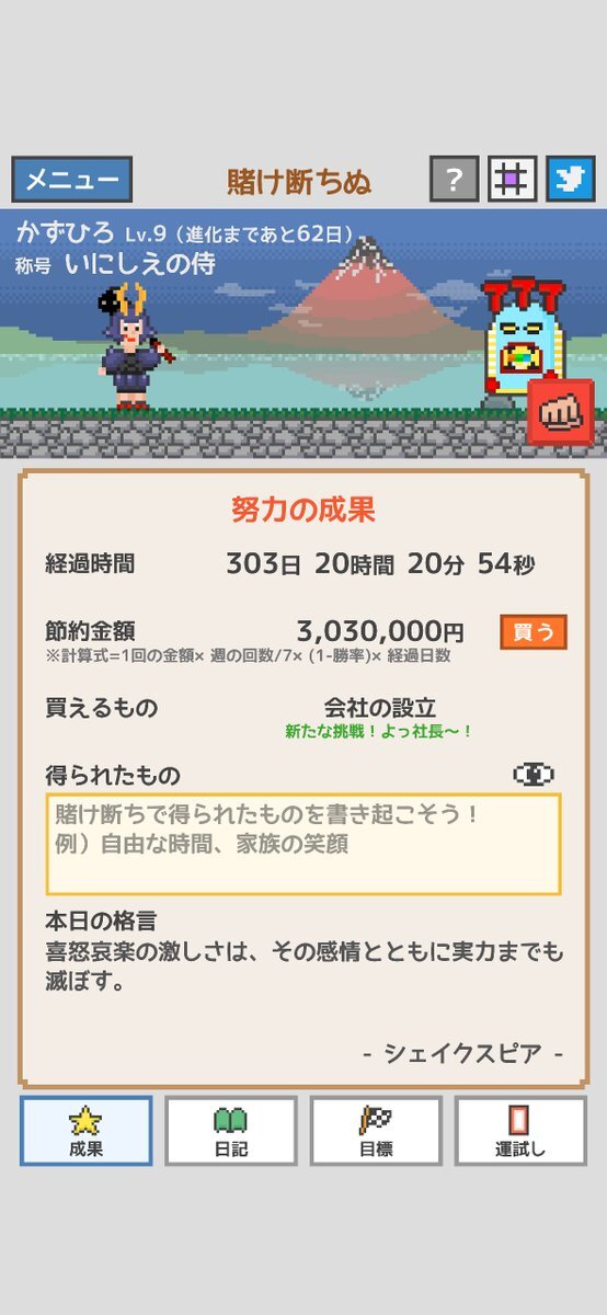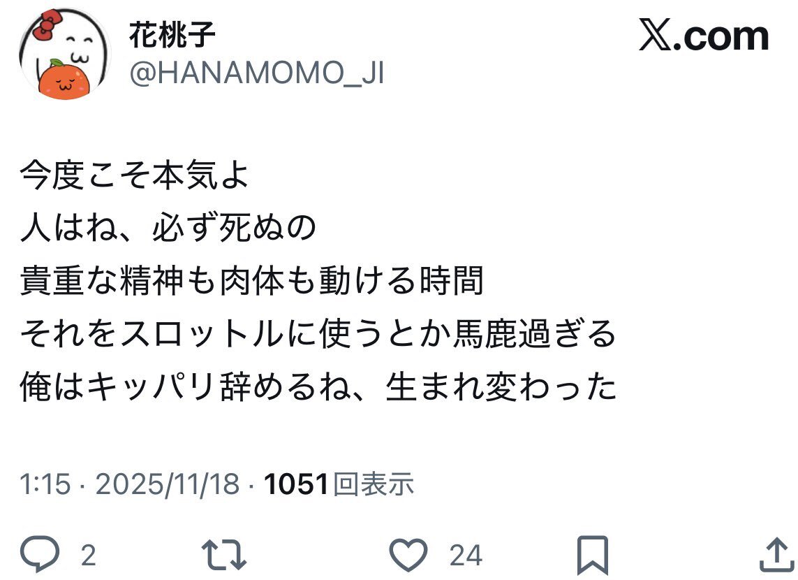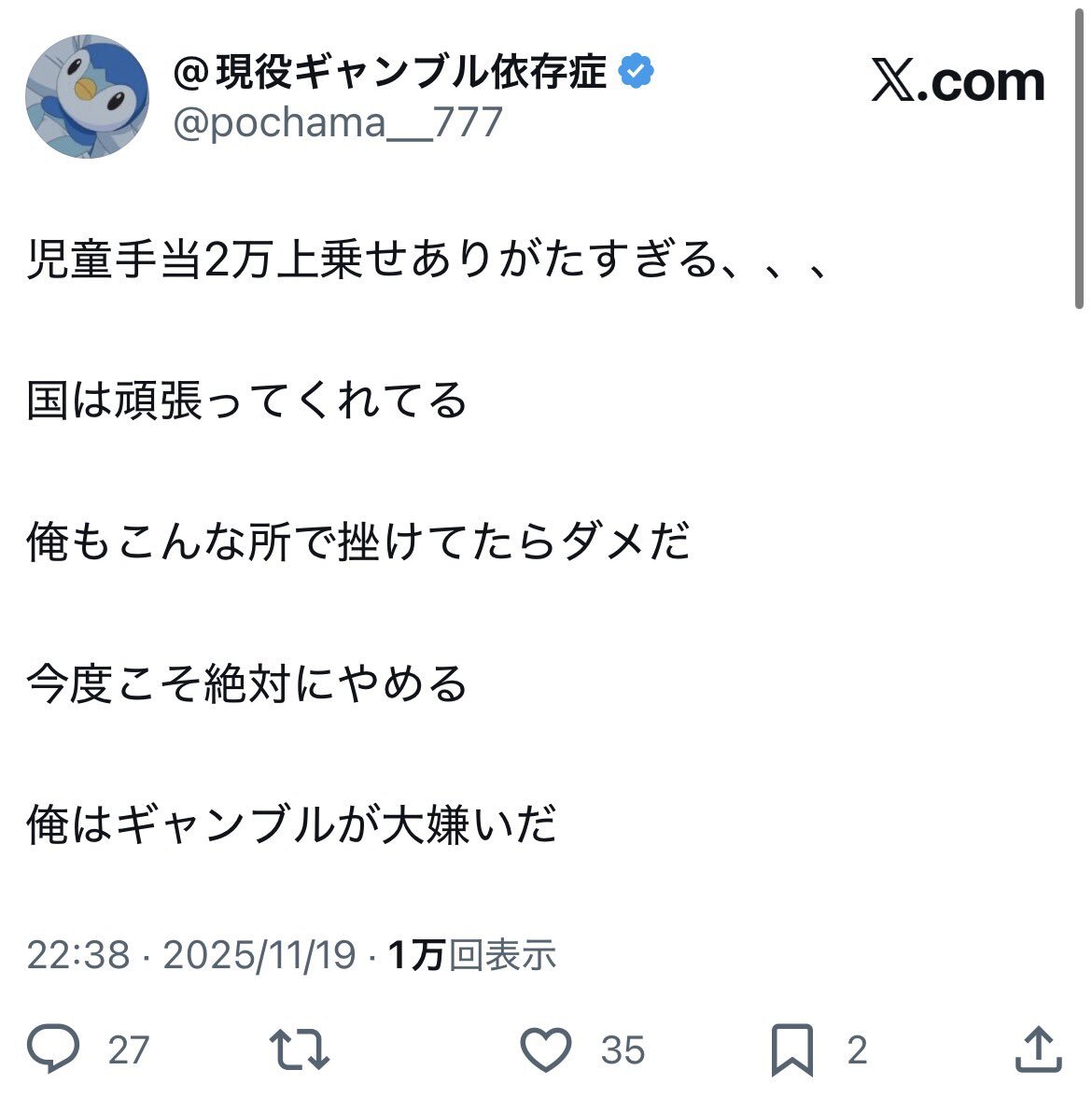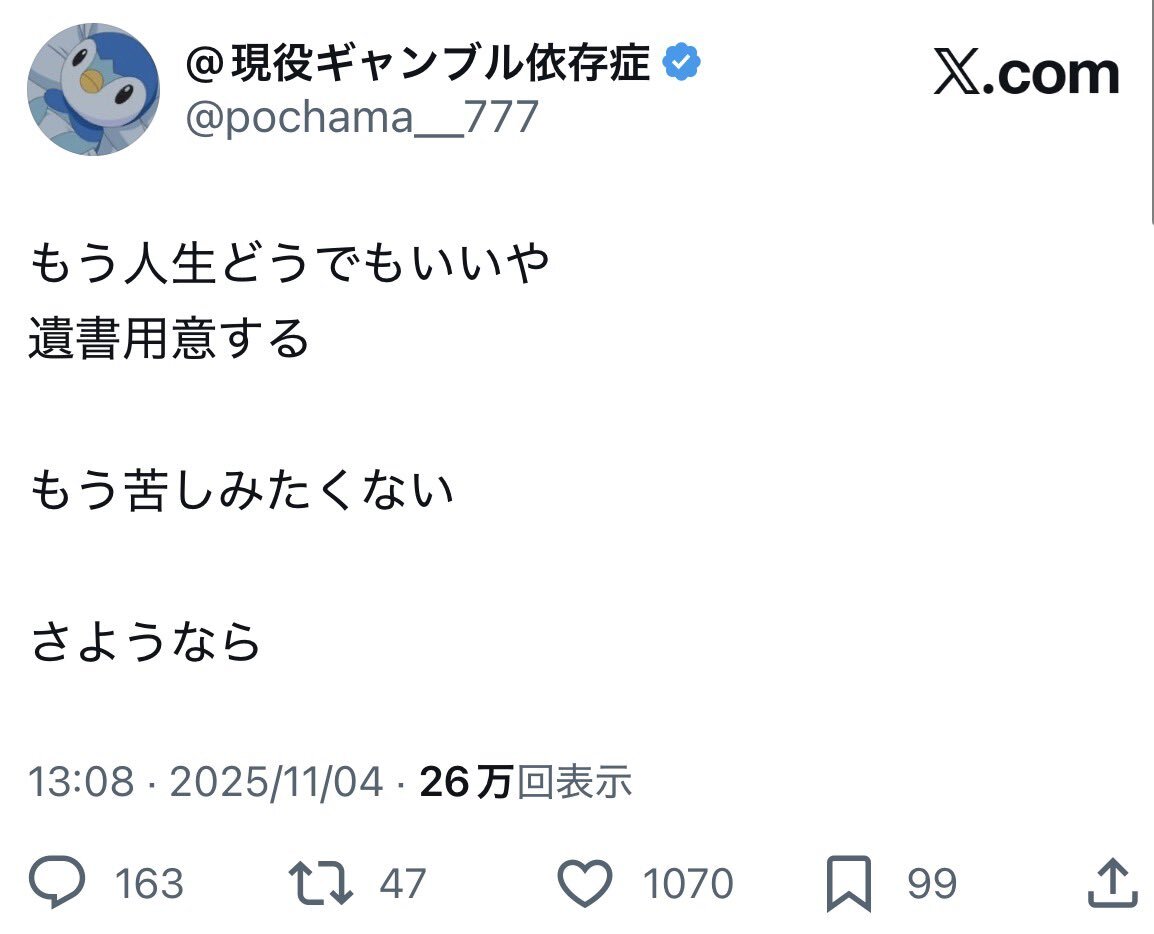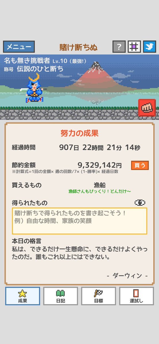迷惑かけてないからいいとか、趣味でやってるだけとか、今日だけとか、色々言い訳が出てくる。こうゆう言い訳を考えちゃうってことはまだまだだな。 徳のある侍、本日も見参⚔️ ギャンブルやめて 36日14時間18分 #賭け断ちぬ #断ギャンブル部 #ギャンブル依存症 naka-shin.co.jp/kaketachi.html