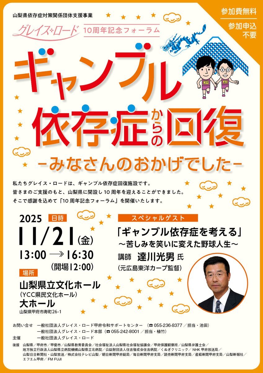 いよいよ明日!#ギャンブル依存症 回復施設 #グレイス・ロード の10周年記念フォーラム開催です🍑 有給とって、朝から #山梨 に行くぞー! *ギャンブル依存症について知りたい *回復施設ってどんなところ? * #達川光男 さんのファンです ・・・等々、少しでもご興味ある方!一緒に参加ませんか? x.com/gracelord_2014…