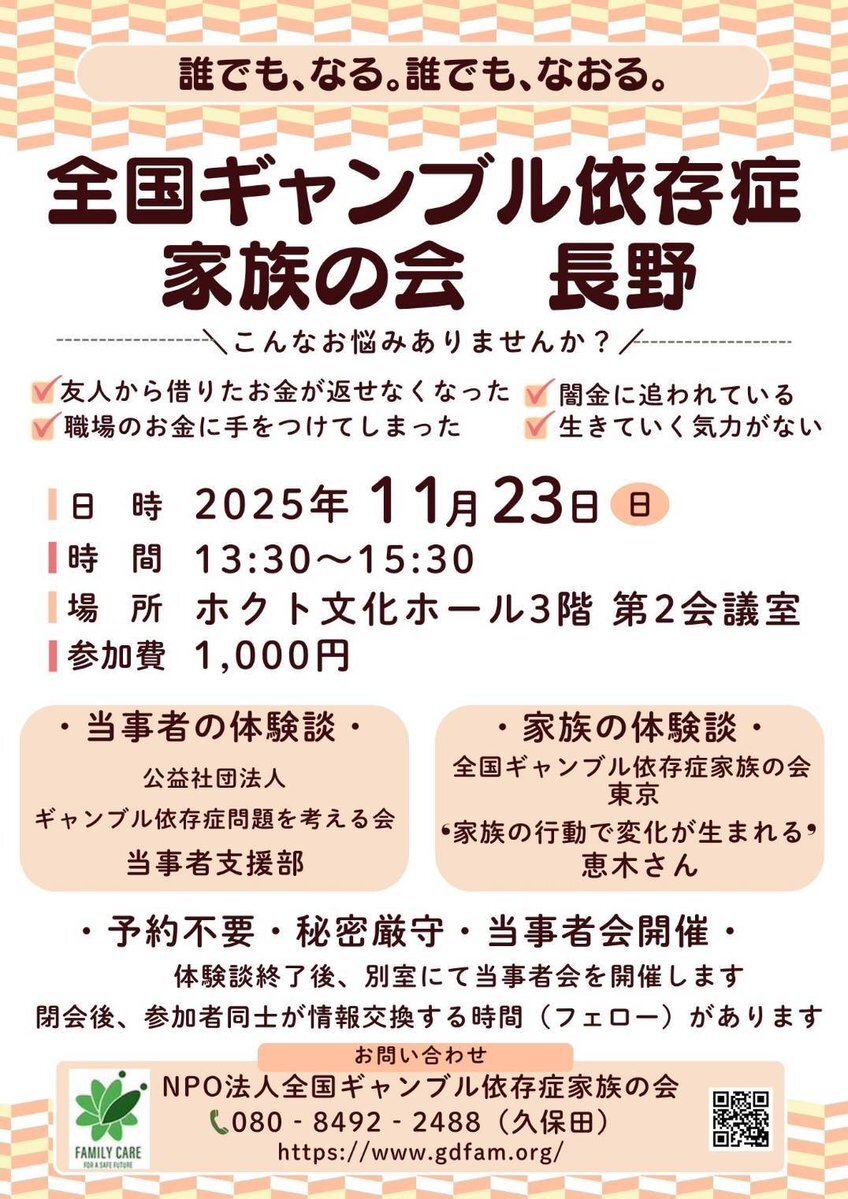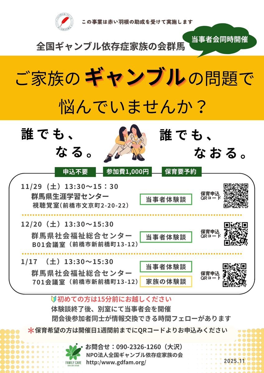 【全国ギャンブル依存症家族の会 群馬】 \\ 家族会のご紹介// 11月29日(土)13:30~15:30 ※初めてご参加の方は15分前にお越しください 場所: 群馬県生涯学習センター 視聴覚室 ⭐️当事者の体験談 ⭐️予約不要 ⭐️参加費1,000円 ⭐️保育有り(要予約) 🌟当事者の会も同時に開催されます🌟
