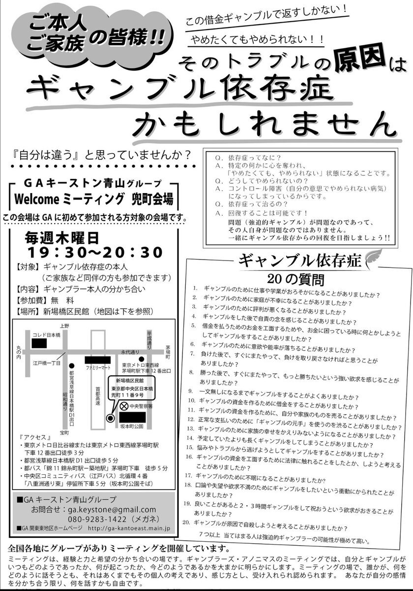 本日、11月20日 19:00〜20:30 GA戸塚コネクト ステップミーティングとなります。 ギャンブルの問題から回復したい当事者は、ぜひお越しください! 参加費不要、予約不要です。 男女共同参画センター横浜フォーラム(戸塚駅西口徒歩5分) #ギャンブル依存症 pic.x.com/jX1DHJMpmV