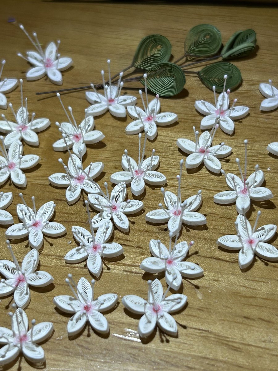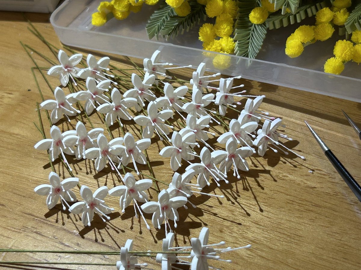 ミモザ制作は一旦終了。 残りは組み立てながら考えよう。 クラッスラ・ポルツラケア (金のなる木)のお花に茎を付けました。 だんだん形になっていくのが楽しい。 #ペーパークイリング #クイリング pic.x.com/u9WldCw1MJ