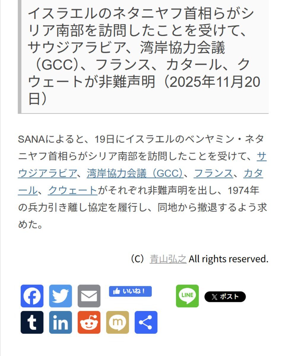 イスラエルのネタニヤフ首相らがシリア南部を訪問したことを受けて、サウジアラビア、湾岸協力会議(GCC)、フランス、カタール、クウェート</a>が非難声明(2025年11月20日) #シリア #サウジアラビア #フランス #カタール #クウェート syriaarabspring.info/?p=126298 pic.x.com/6VYwWI41kr