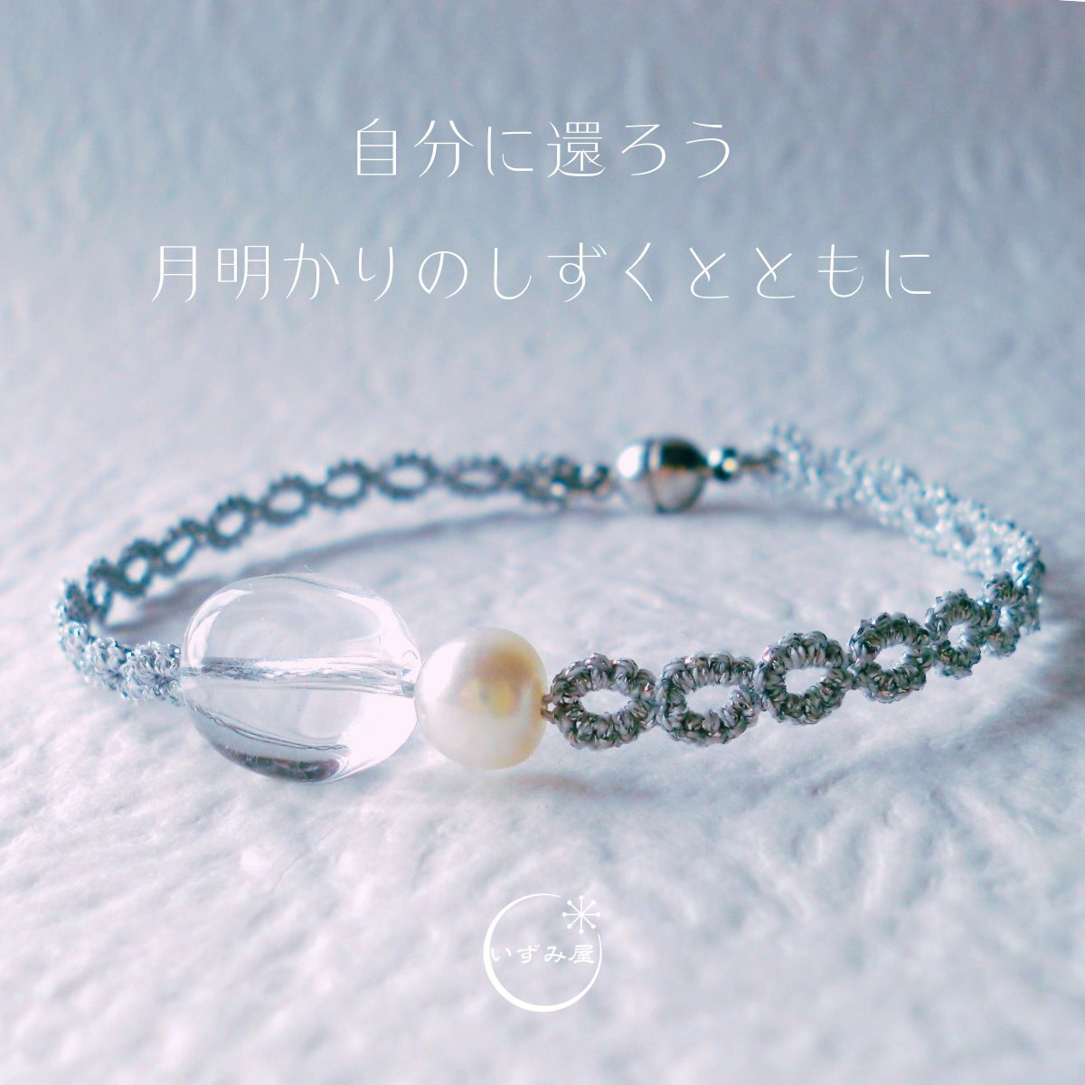 月のしずく🌙 タティングレース:シルバーラメ 天然石:水晶(タンブル) バロックパール(ホワイト) 静かな、静かなブレスレットです Creema creema.jp/c/izumiya11038 #ハンドメイドアクセサリー #クォーツ #パワーストーン pic.x.com/T5WU5YfYzT