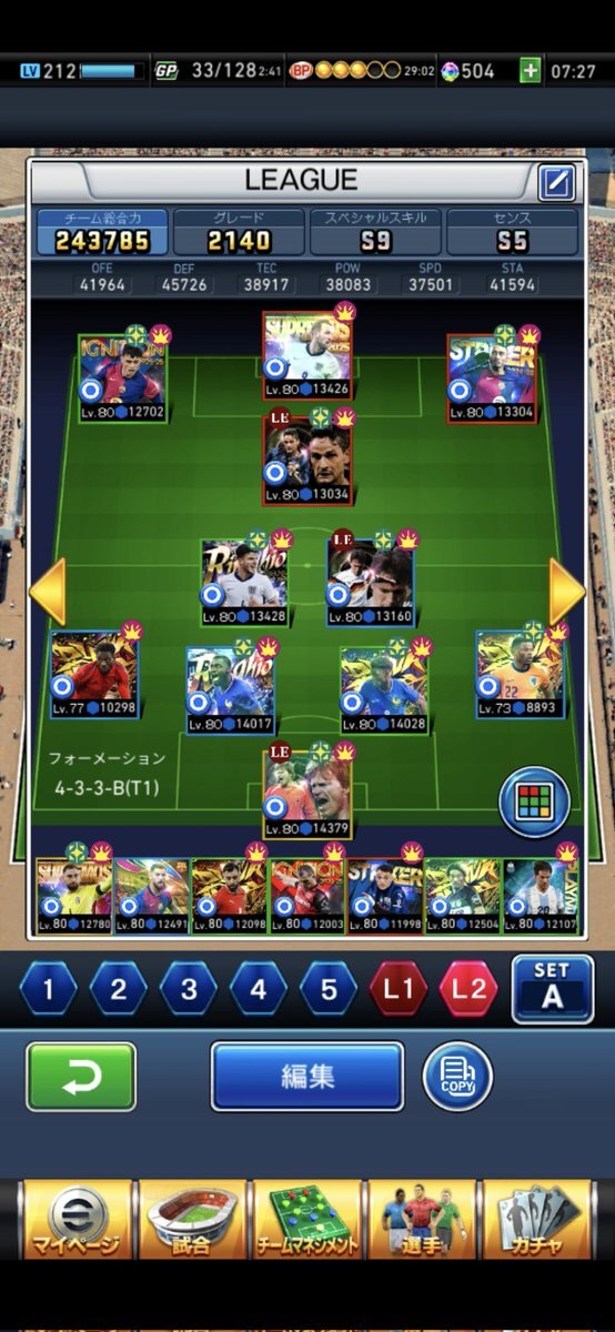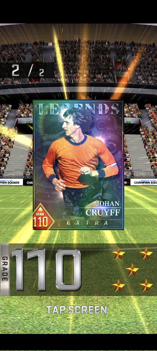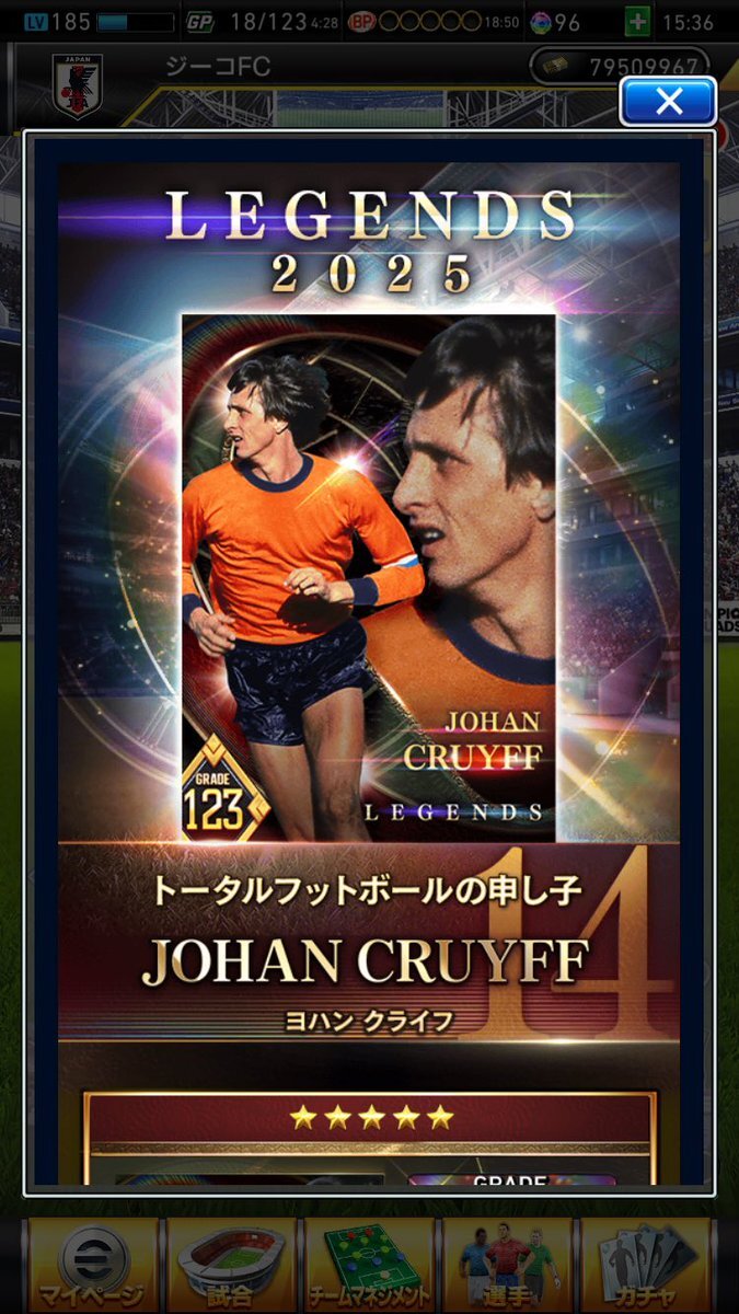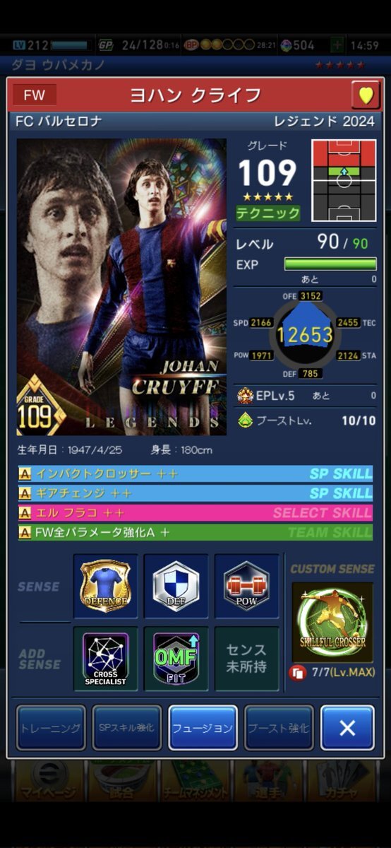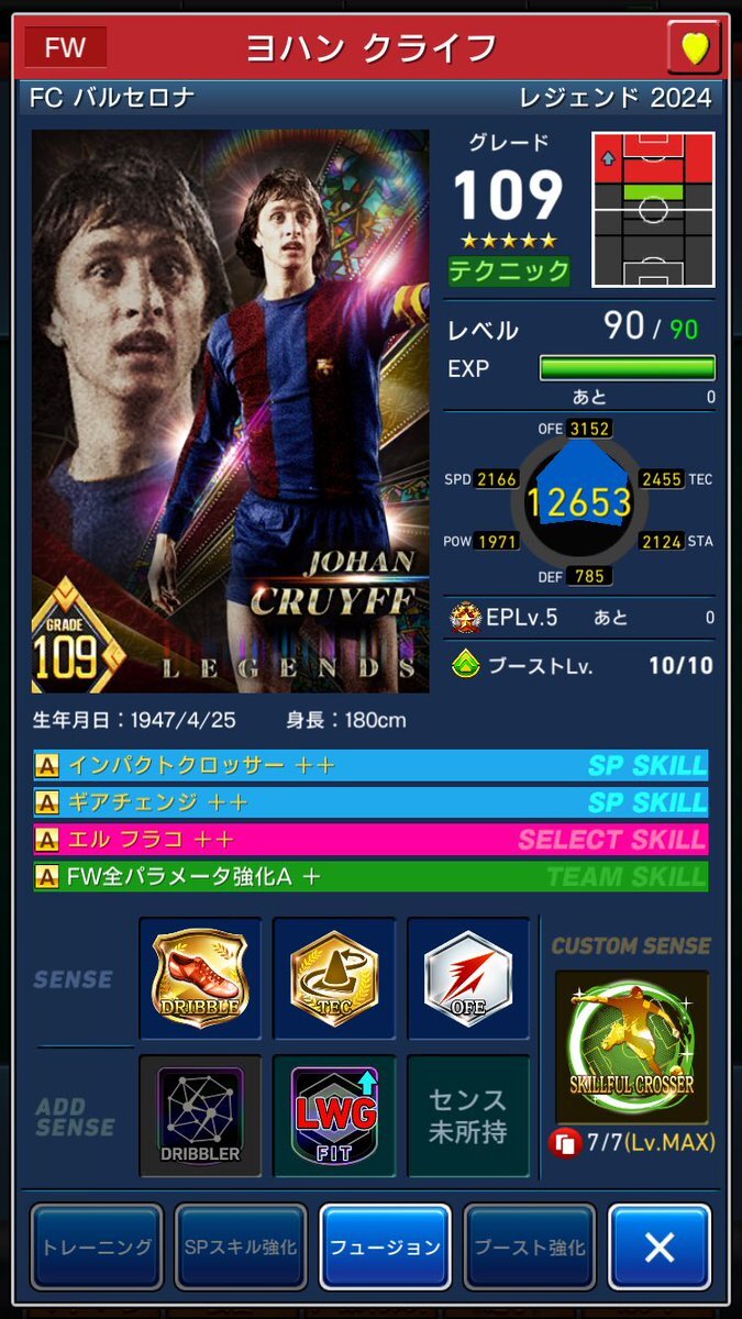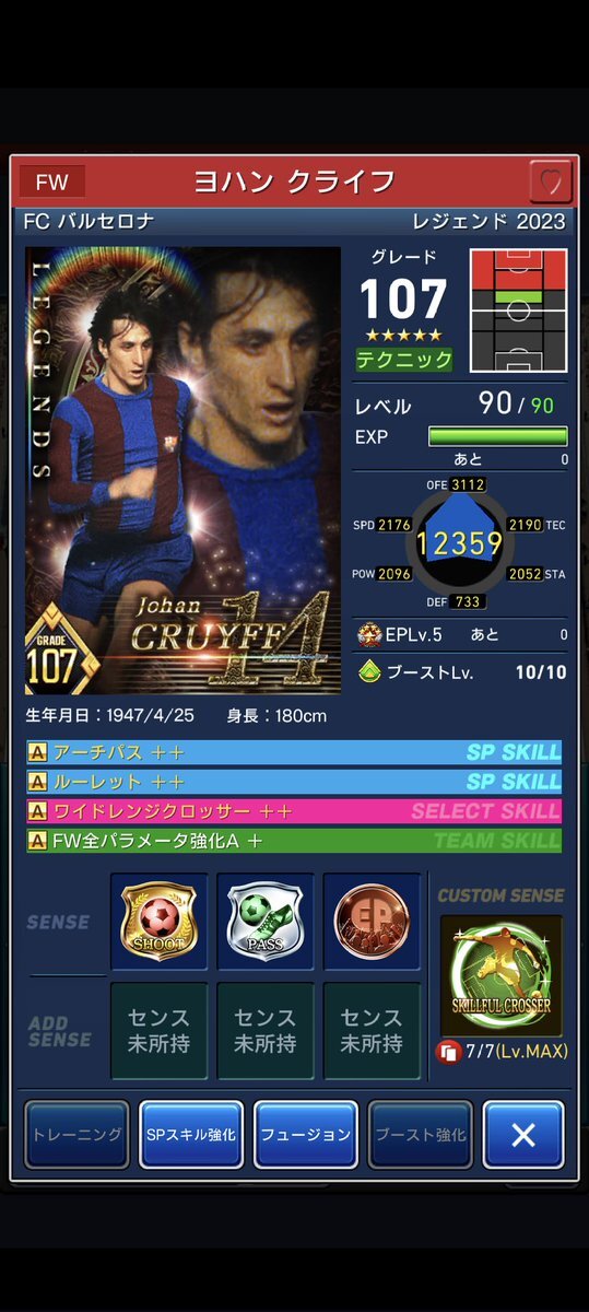 劣化ロニー、劣化プラティニ、的な感じがするスキル構成ですが、両方ないので取れたら嬉しいな。 クライフは大好き!!しかも、旧バージョン持ってるしね。スキル育ってないな。。 #ウイコレ #クライフ pic.x.com/JhLdOicYTu