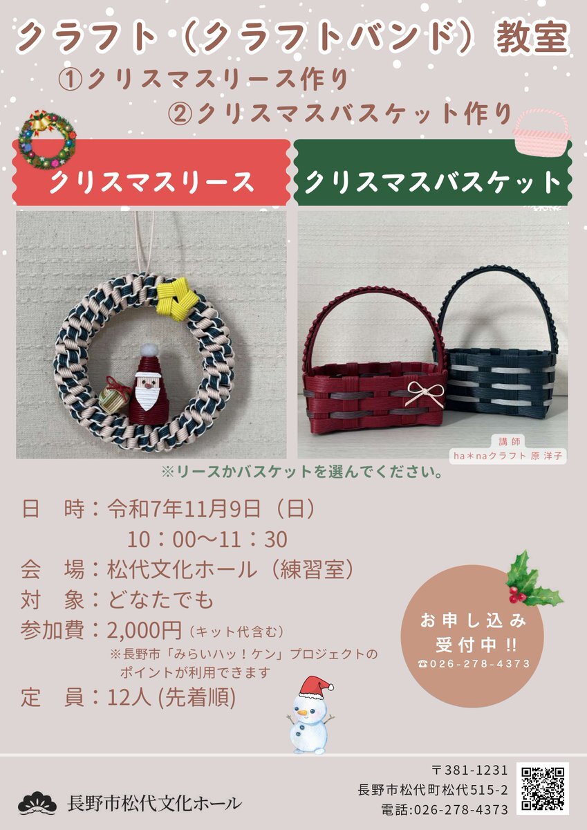 11月9日に「クリスマスリース/クリスマスバスケット作り」を開催します。一足早いクリスマスプレゼント作りはいかがですか? お申込お待ちしています。電話 026-278-4373 #松代文化ホール #クラフトバンド #クリスマス #クリスマスプレゼント #クリスマスリース #クリスマスバスケット #クラフト教室 pic.x.com/Xmj1rvjpDS