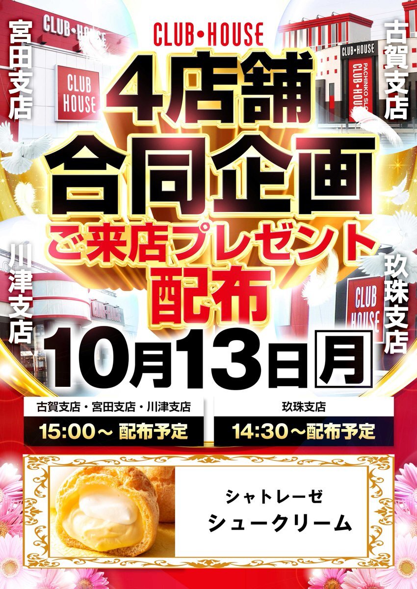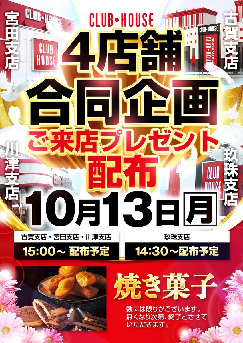 おはようございます #クラブハウス宮田支店 です😀 本日10月13日(月)㊗️は #クラブハウス 4店舗合同企画 ご来店プレゼント配布 を(予定)しております 美味しい焼き菓子を 15時(予定)に配布していきます 日ごろのご来店に感謝の気持ちを込めて❤️ 皆様のご来店お待ちいたしております🤩 pic.x.com/npSctIbhar