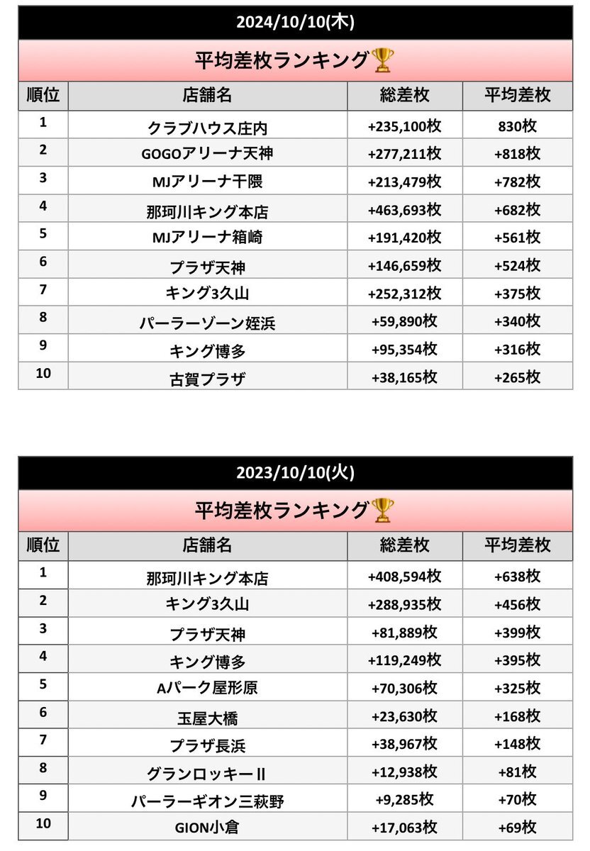 【福岡】2024年/2023年 10月10日 平均差枚ランキング🏆 . ✔️2024年10月10日(木) 🥇クラブハウス庄内 +830枚 🥈GOGOアリーナ天神+818枚 🥉MJアリーナ干隈+782枚 ▫️那珂川キング本店+682枚 ▫️MJアリーナ箱崎+561枚 ▫️プラザ天神+524枚 ▫️キング3久山+375枚 ▫️パーラーゾーン姪浜+340枚 x.com/nekomaru_kyush…