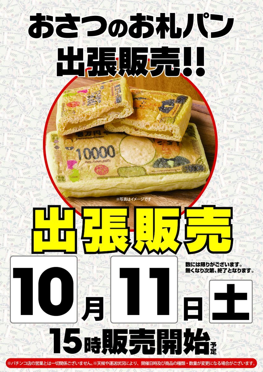 明日(11日)の庄内支店。 見よ!この渋沢栄一の札◯◯を!? …… ………… あ、札パンの販売です。 & 全店合同 GC取材‼️ 明日11日は1人じゃないぜっ クラブ店長みんなで開店じゃい❗️ #クラブハウス庄内支店 #クラブハウス #全店合同 #おさつのお札パン pic.x.com/706RQsMYsU