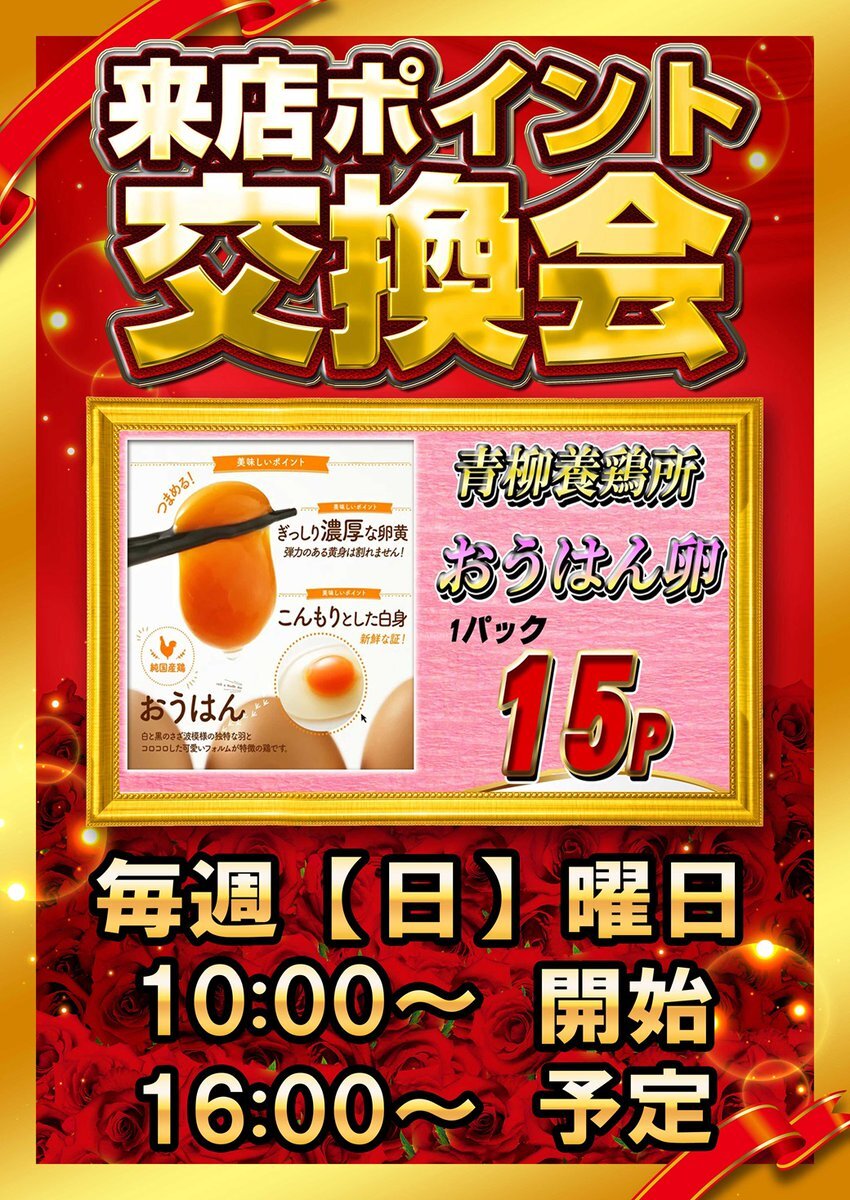 おはようございます🌞 #クラブハウス 古賀支店です🫡 本日12日【日】は 🥚#来店ポイント交換会(卵)🥚 🐔交換開始時間🐔 ①10:00~ ②16:00~ 多くのお客様のご来店 お待ちしております💖 pic.x.com/LDlXsiRsL7