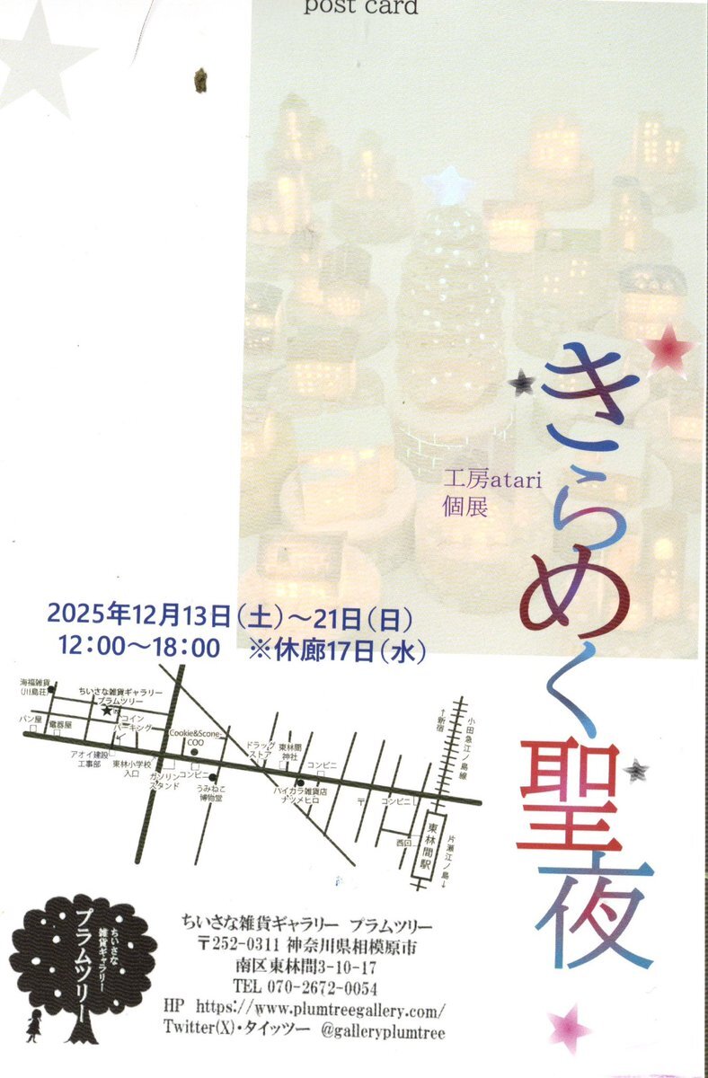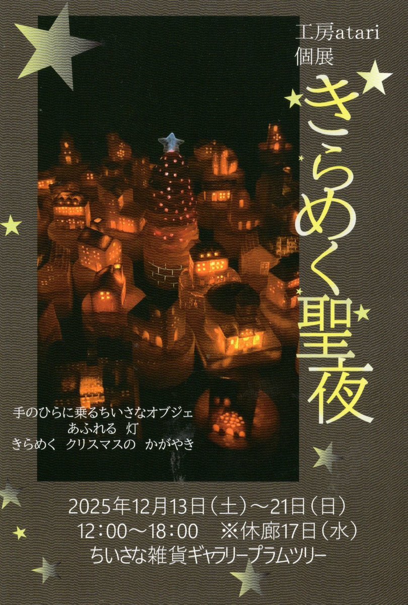 クリスマスの夜景をお楽しみください⭐︎ 工房atari個展「きらめく聖夜」 12/13(土)〜21(日)12時〜18時 17(水)定休日 ちいさな雑貨ギャラリープラムツリー 〒252-0311 神奈川県相模原市南区東林間3-10-17 TEL 070-2672-0054 #夜景 #クリスマス #光 pic.x.com/5DEABXTHS8
