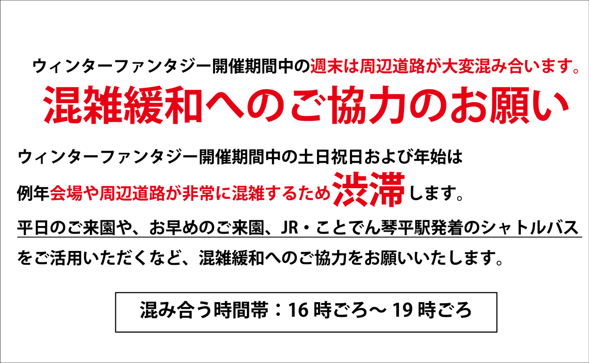 【渋滞緩和へのご協力のお願い】 イベント開催期間中の土日祝日は周辺道路や園内が非常に混雑・渋滞いたします。イルミネーションをゆっくりとお楽しみいただくため平日のご来園や、お早目のご来園、JR・ことでん琴平駅発着の有料シャトルバスのご利用をおすすめいたします。 sanukimannopark.jp/event/winter-f…