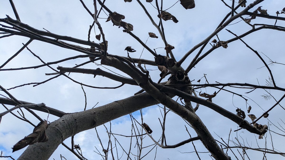 クルミの木のクルミはカラスの餌にしかならないし、○🐐もクルミの枝葉を食べないので切れるところでズバズバ剪定した。 太さ20cmくらいの枝をやっと切れたと思ったら、別の枝に引っかかって落下しない💦上から蹴っても下から引っ張っても無理だった。あら〜 #クルミの木 #剪定 2025/11/17