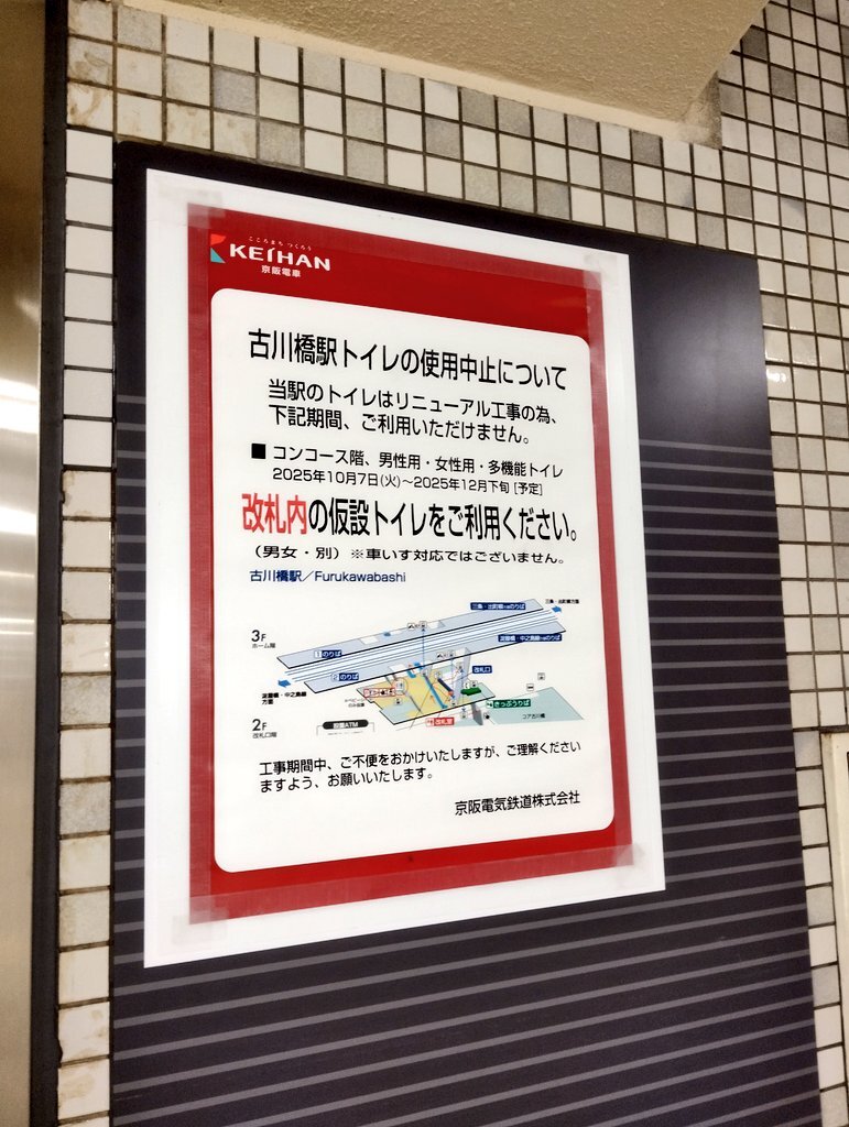 #クレーン 京阪の古川橋駅って最近どうなってるねんってみんな気になってるやん? 今はねぇトイレのリニューアル工事中で仮設トイレで女達はキャーキャー言いながら使っているよ、ウォシュレットなしのカバン掛けなし! pic.x.com/RMZH5b8m3B