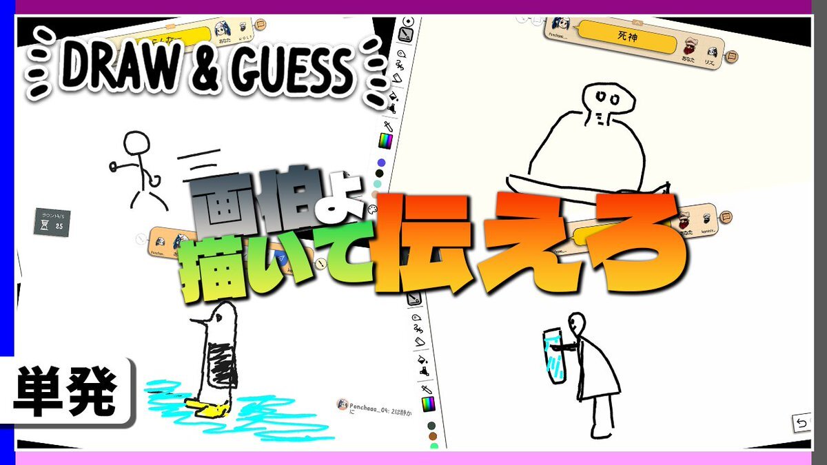 本日は4人単発企画の投稿です! ゲームタイトルは『 Draw & Guess 』です! 4人で1番の画伯は誰かな?? 19時投稿予定なので、お時間あればみてくださいな!! #ゲーム実況者さんと繋がりたい #ゲーム実況者好きさんと繋がりたい pic.x.com/QjpspDjtMK