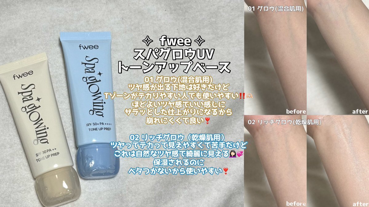 ୨୧ #gifted ୨୧ ✧ fwee スパグロウUVトーンアップベース 01グロウ(混合肌用) 02リッチグロウ(乾燥肌用) Tゾーンがテカる人は01 乾燥しやすい部分は02を部分使いするのが良いかも🫶🏻 #むーんぱわーさろん プレキャン企画で頂きました‼️ #コスメ好きさんと繋がりたい #美容垢さんと繋がりたい pic.x.com/xBDjP0OGjw