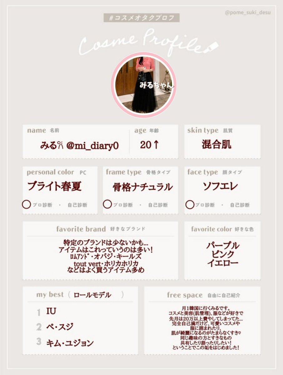 作ってみたかったプロフ完成🙆♀️ 使っているものはころころ変わるので1枚目だけ! ❤️orRTでゆっくりお迎えに行きます🎶 #コスメオタクプロフ #美容垢さんと繋がりたい #美容好きさんと繋がりたい