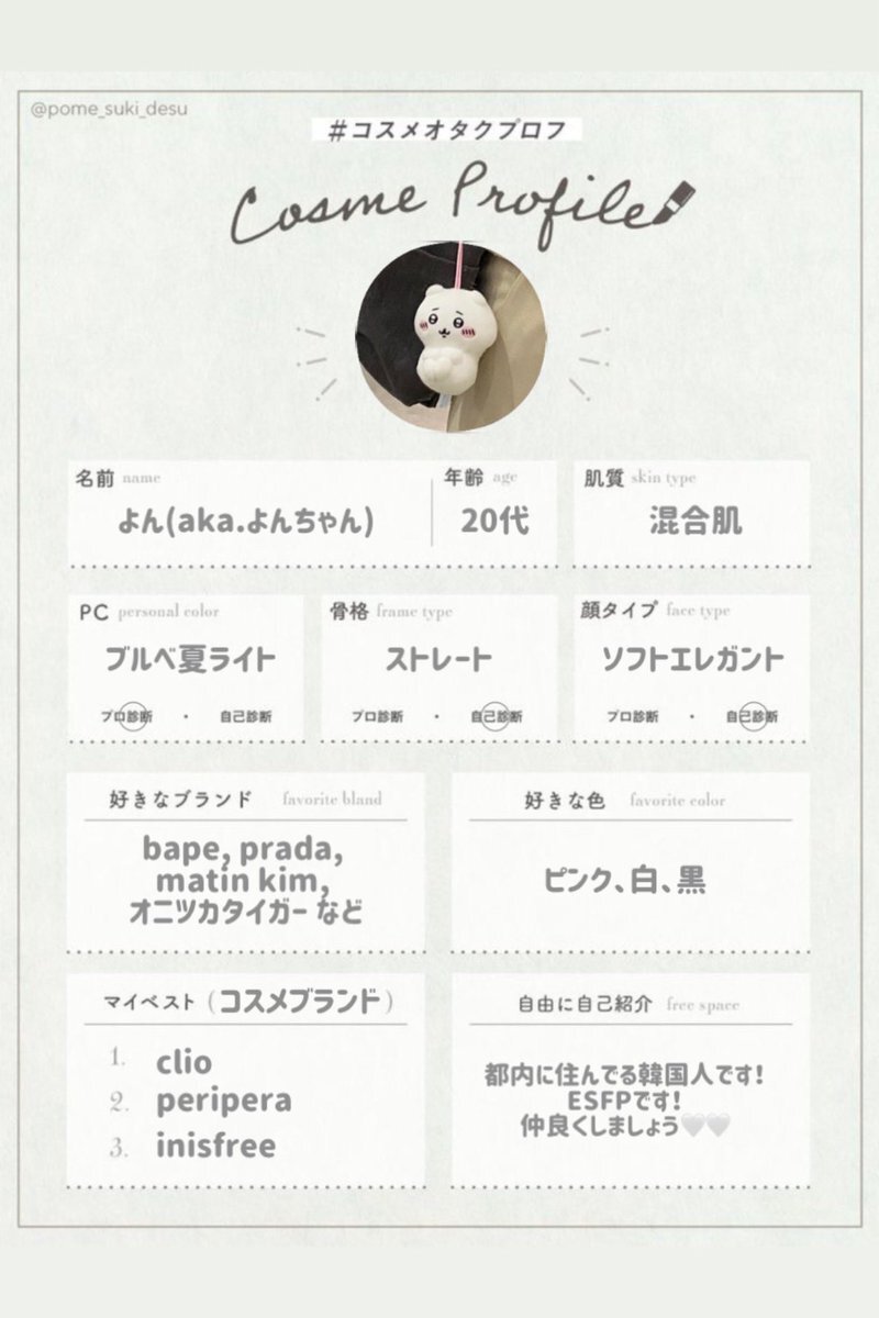 新しく #コスメオタクプロフ 作りました💖 ぽめすきさんよりいただきました ✿ 美容・コスメだいすきです🥰❣️ 是非たくさんお話したいです( ᴗ͈ˬᴗ͈)ഒ✨ デパコス、プチプラ、韓国コスメ買います🌟 #コスメ好きさんと繋がりたい ♡ or ↻で気になった方お迎えいきます🌷 よろしくお願いします😽💞