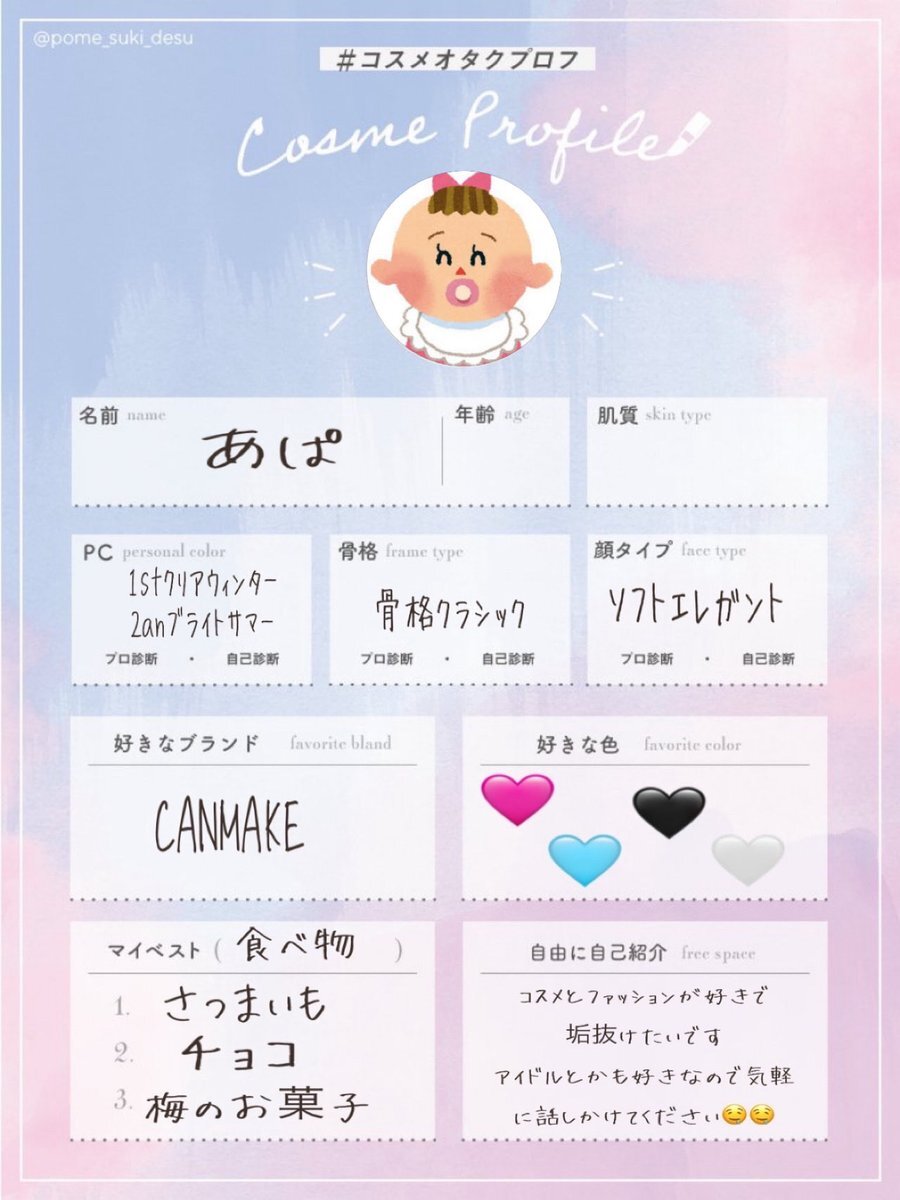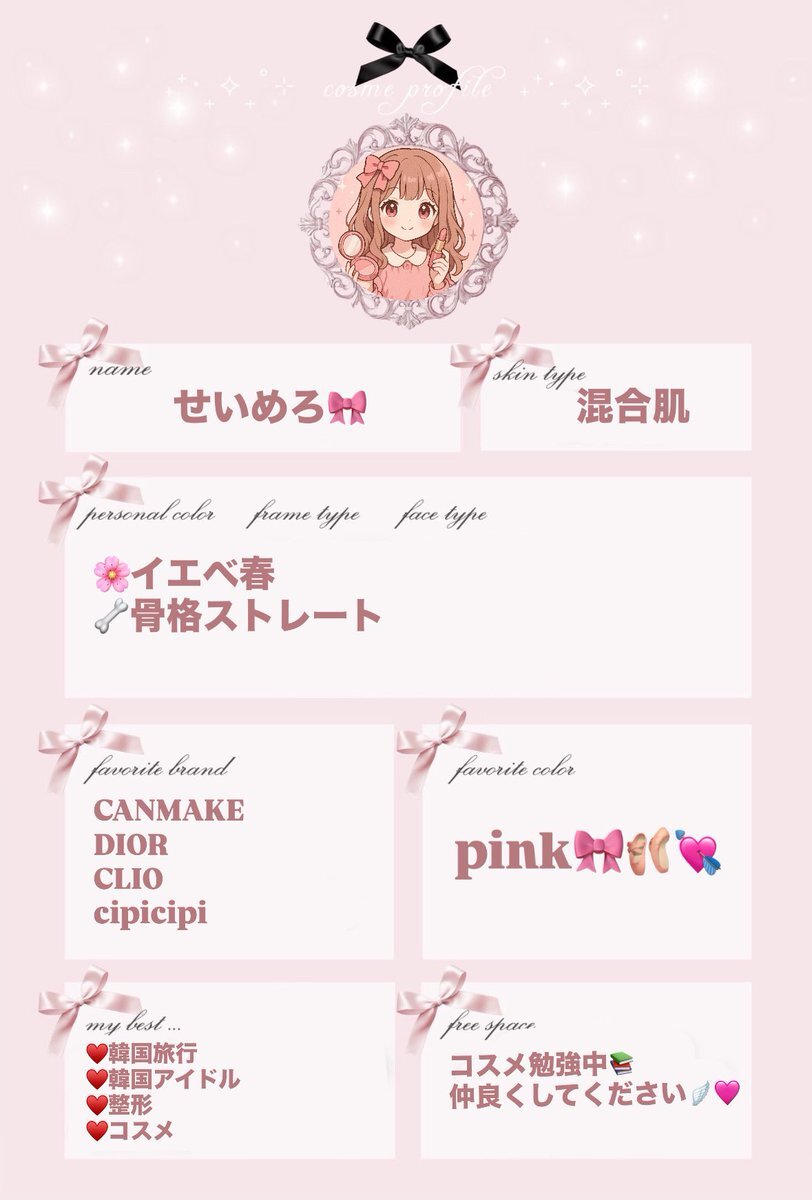 コスメプロフ作りました! テンプレートお借りしましたm(_ _)m🎀 純コスメ垢ではなくて、趣味だったり、懸賞だったり色々やってます💄🪽🫧 #コスメオタクプロフ #美容垢さんと繋がりたい #コスメ好きさんと繋がりたい #自分磨き記録 #美容好きと繋がりたい pic.x.com/wn7GrriK2v