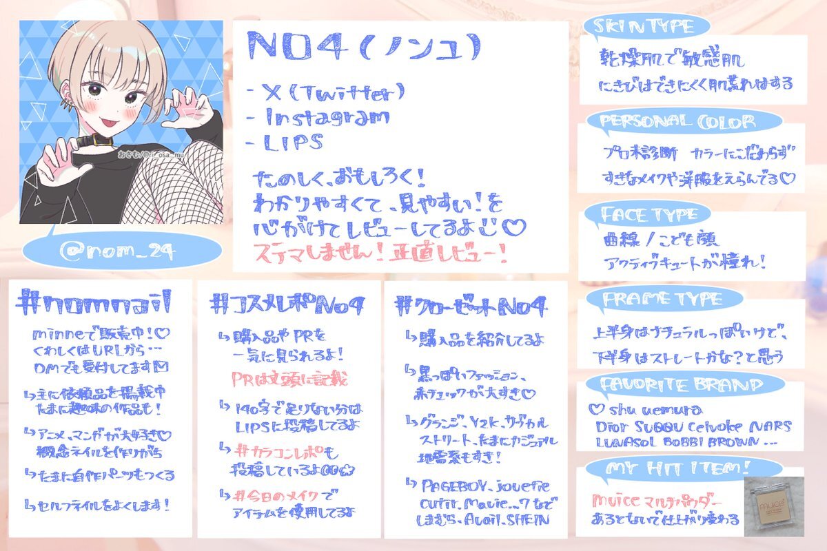 引用元への反応お願いします🐰🩵 ♡で気になった方お迎え致します🚗💨 #コスメオタクプロフ #コスメ好きさんと繋がりたい #編み物好きさんと繋がりたい #にじさんじ好きさんと繋がりたい #にじさんじ自己紹介カード x.com/blue_ruka_97/s…