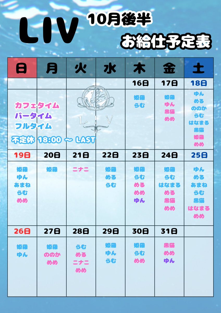 10月後半 お給仕キャスト🪼 イベント情報はリプ欄💙 10月 18日(土)、19日(日) ゆん生誕祭 @yun_liv_ 10月 25日(土) める生誕祭 @meruchan_liv お給仕時間、リクエスト出勤は各キャストへ お気軽にお問い合わせ下さい➩💭 ご来店お待ちしております🦈🫧 🩵ポケパラ『LIV』🩵