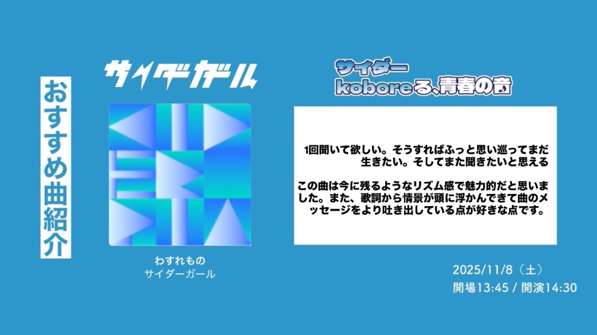 【#市大祭おすすめ曲紹介】 「わすれもの」/サイダーガール(@cidergirl_info) #サイダーガール #見放題 #市大祭 #市大祭ライブ #名古屋市立大学 pic.x.com/zu1vo8QtBU