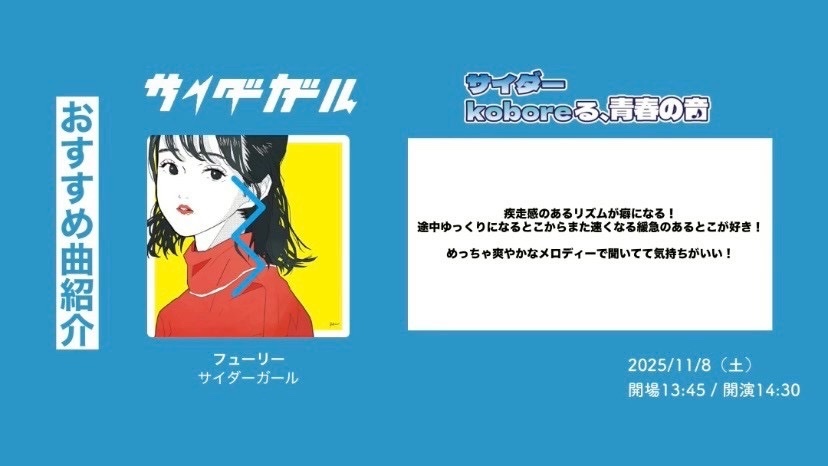 【#市大祭おすすめ曲紹介】 「フューリー」/サイダーガール(@cidergirl_info) #サイダーガール #見放題 #市大祭 #市大祭ライブ #名古屋市立大学 pic.x.com/iYezKvg1Ts