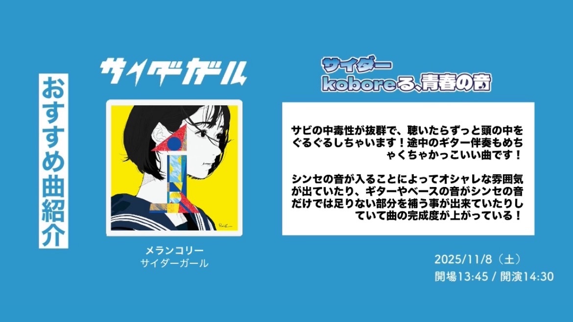 【#市大祭おすすめ曲紹介】 「メランコリー」/サイダーガール(@cidergirl_info) #サイダーガール #見放題 #市大祭 #市大祭ライブ #名古屋市立大学 pic.x.com/mDMm1hK2b5
