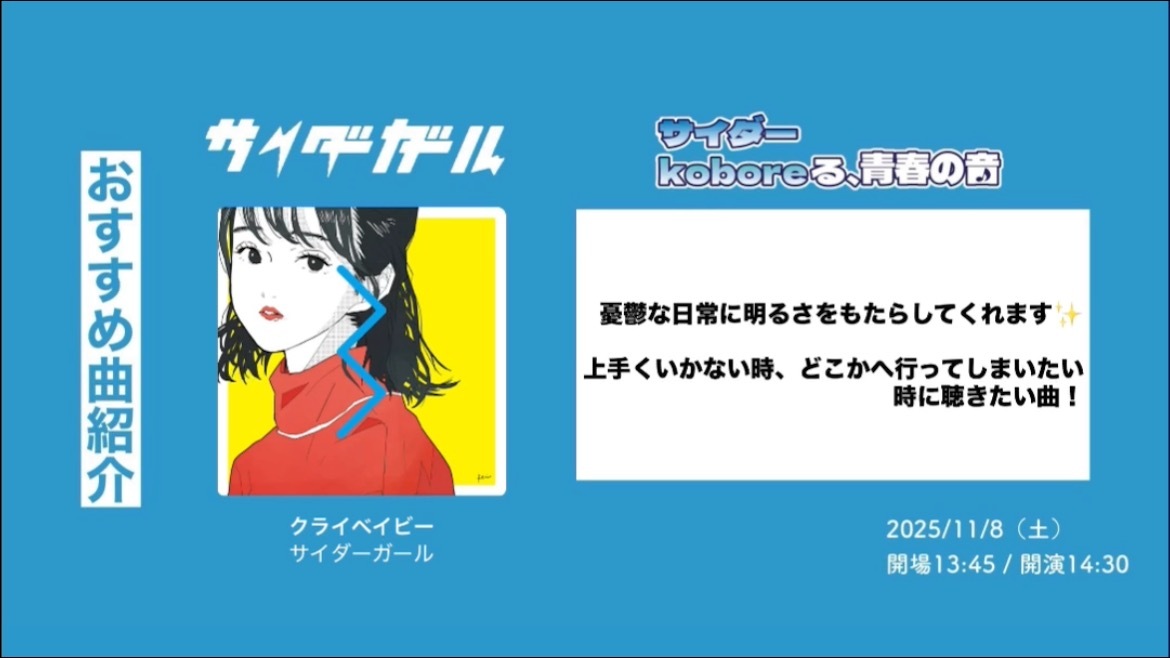 【#市大祭おすすめ曲紹介】 「クライベイビー」/サイダーガール(@cidergirl_info) #サイダーガール #見放題 #市大祭 #市大祭ライブ #名古屋市立大学 pic.x.com/uJoiRDwzGq